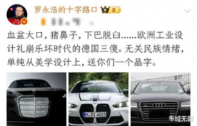 “血盆大口,猪鼻子,下巴脱臼……欧洲工业设计礼崩乐坏时代的德国三傻。”近日,罗永浩在社交媒体上对宝马、奔驰、奥迪的设计发出了尖锐批评,直言不讳地表达了对这些传统豪华品牌最新设计语言的不满。